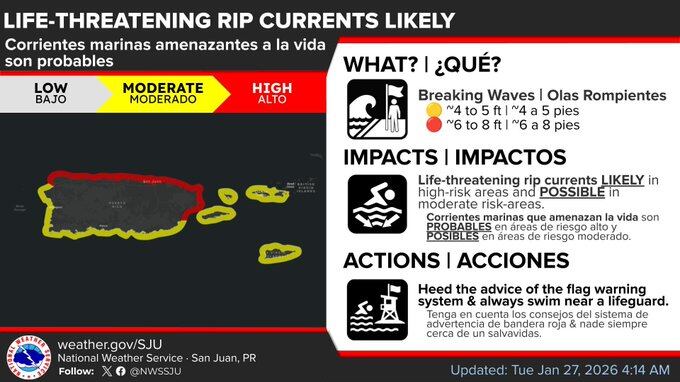 Oleaje peligroso para hoy en aguas del Atlántico. Aguaceros pasajeros en el este y USVI, y en la tarde en el oeste. #prww #usviwx pic.twitter.com/f8vUSg9ZVE— NWS San Juan (@NWSSanJuan) January 27, 2026