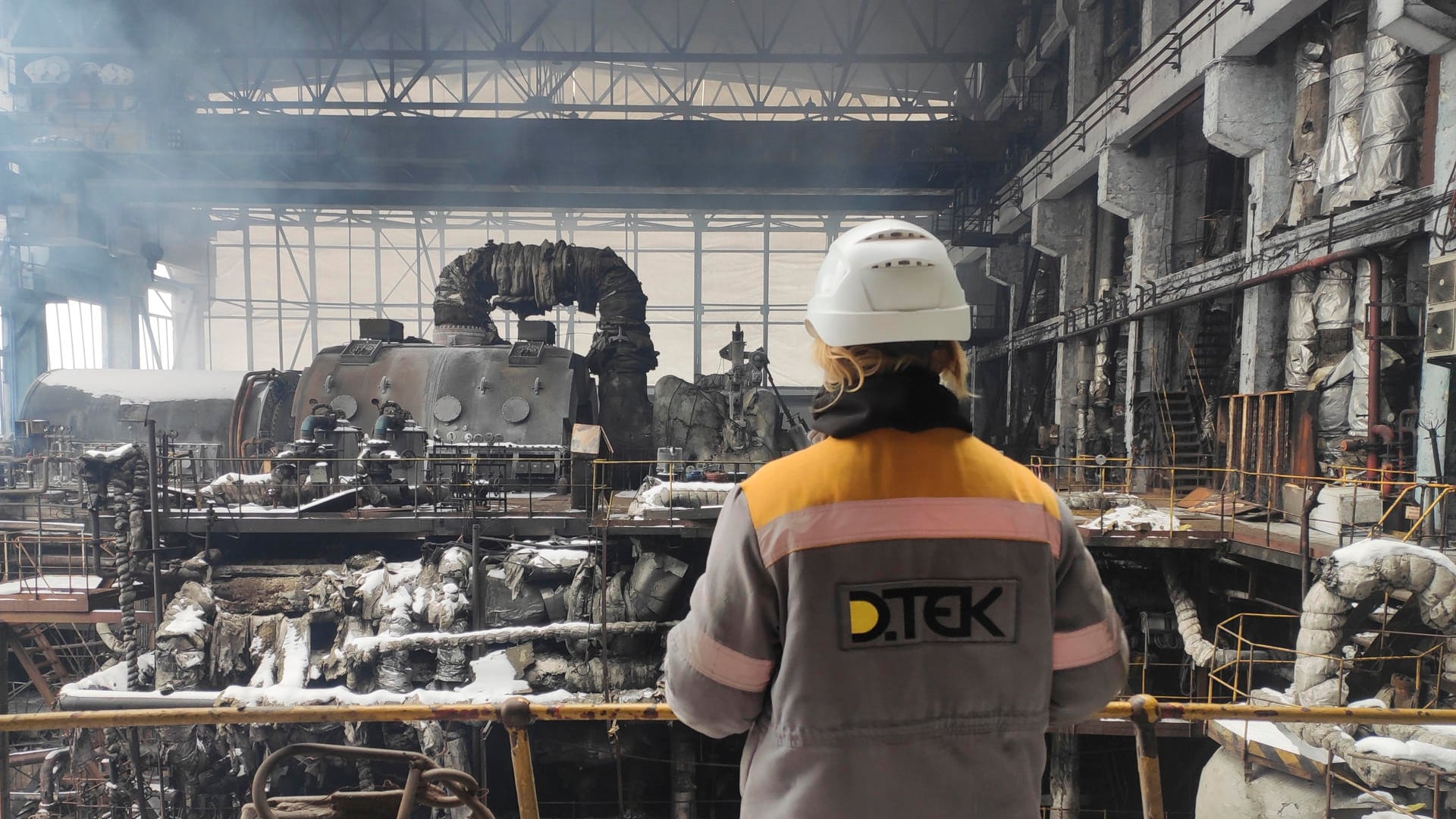 Empleados de una central térmica propiedad de DTEK en Ucrania, junto a las secciones dañadas por ataques con drones y misiles rusos. Los trabajadores desafían el frío y el riesgo de ataques rusos para restaurar el suministro eléctrico mientras millones de hogares sufren apagones prolongados debido a los ataques rusos al sistema energético en medio del invierno.-EFE/ Rostyslav Averchuk (EFE)