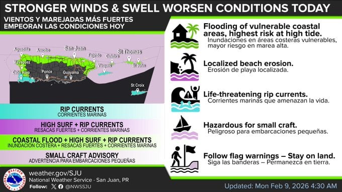 Tiempo estable, pero vientos y marejadas causan peligros.#PRwx #USVIwx pic.twitter.com/rfMWjCot5G— NWS San Juan (@NWSSanJuan) February 9, 2026