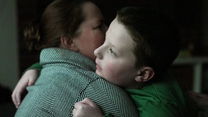 Ronan Murphy, quien padece de autismo profundo, abraza a su madre, Andrea, mientras ve la nieve caer afuera de su casa, en Ayer, Massachusetts, el 17 de enero de 2026. (AP Foto/Shelby Lum)