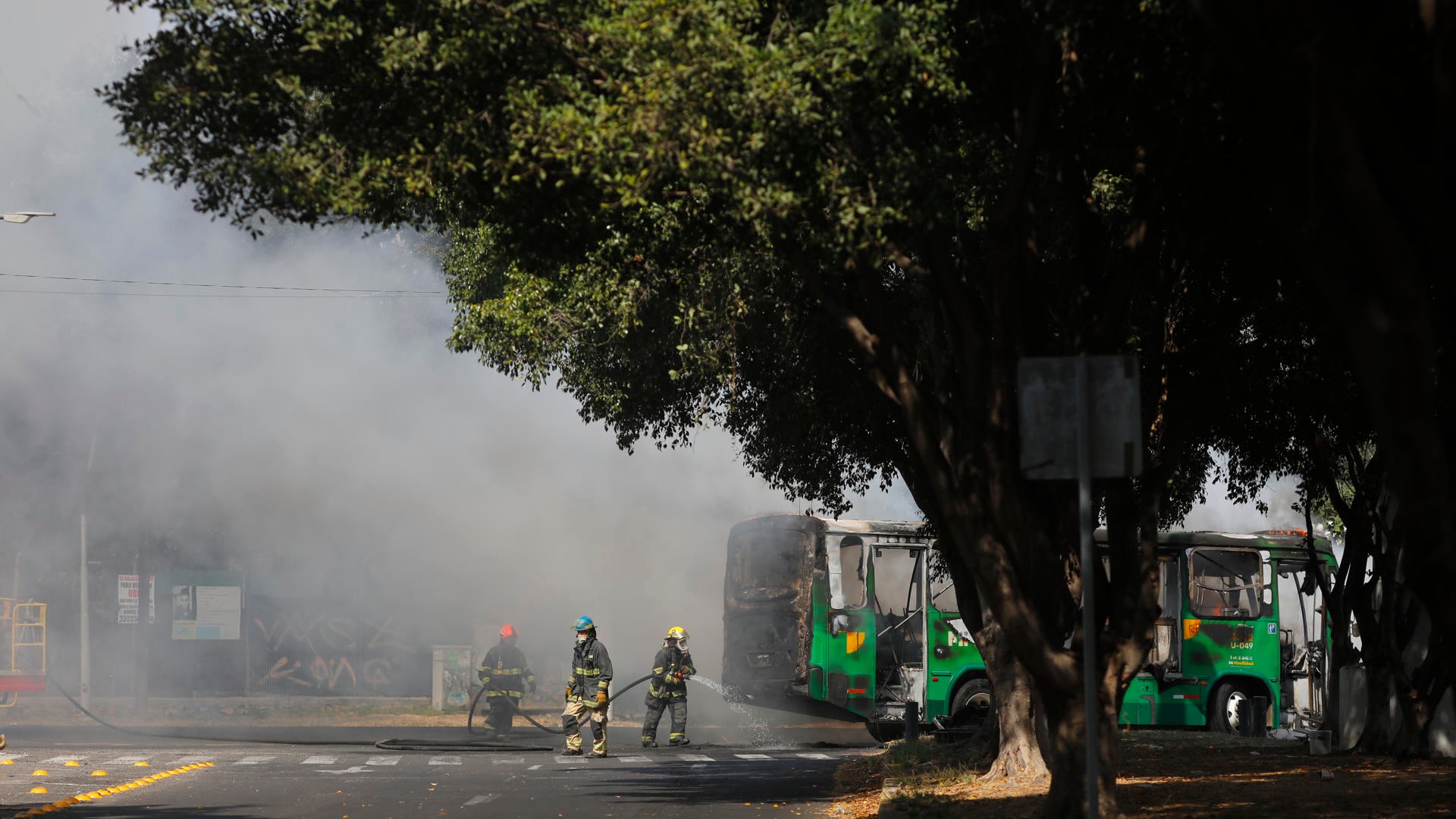Integrantes del Cuerpo de Bomberos de Guadalajara intentan apagar un vehículo incendiado el pasado domingo, en Guadalajara (México). EFE/ Francisco Guasco (EFE)