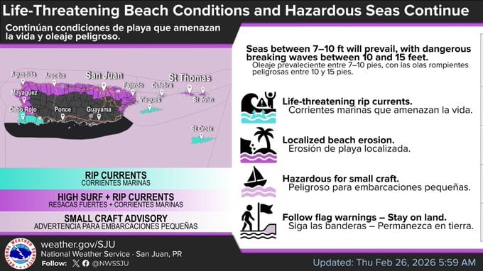 Las condiciones peligrosas en el mar y en las playas continúan en la costa atlántica de Puerto Rico. Se esperan corrientes marinas peligrosas y fuerte rompiente desde Rincón hasta Fajardo, incluyendo Culebra.