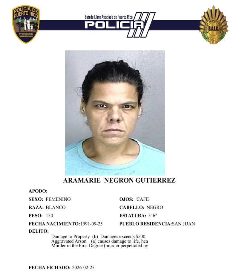 Aramarie Negrón Gutiérrez, de 34 años, enfrenta cargos por asesinato en primer grado, incendio agravado, daño agravado y maltrato, y no prestó la fianza global de un millón de dólares que le fue impuesta.