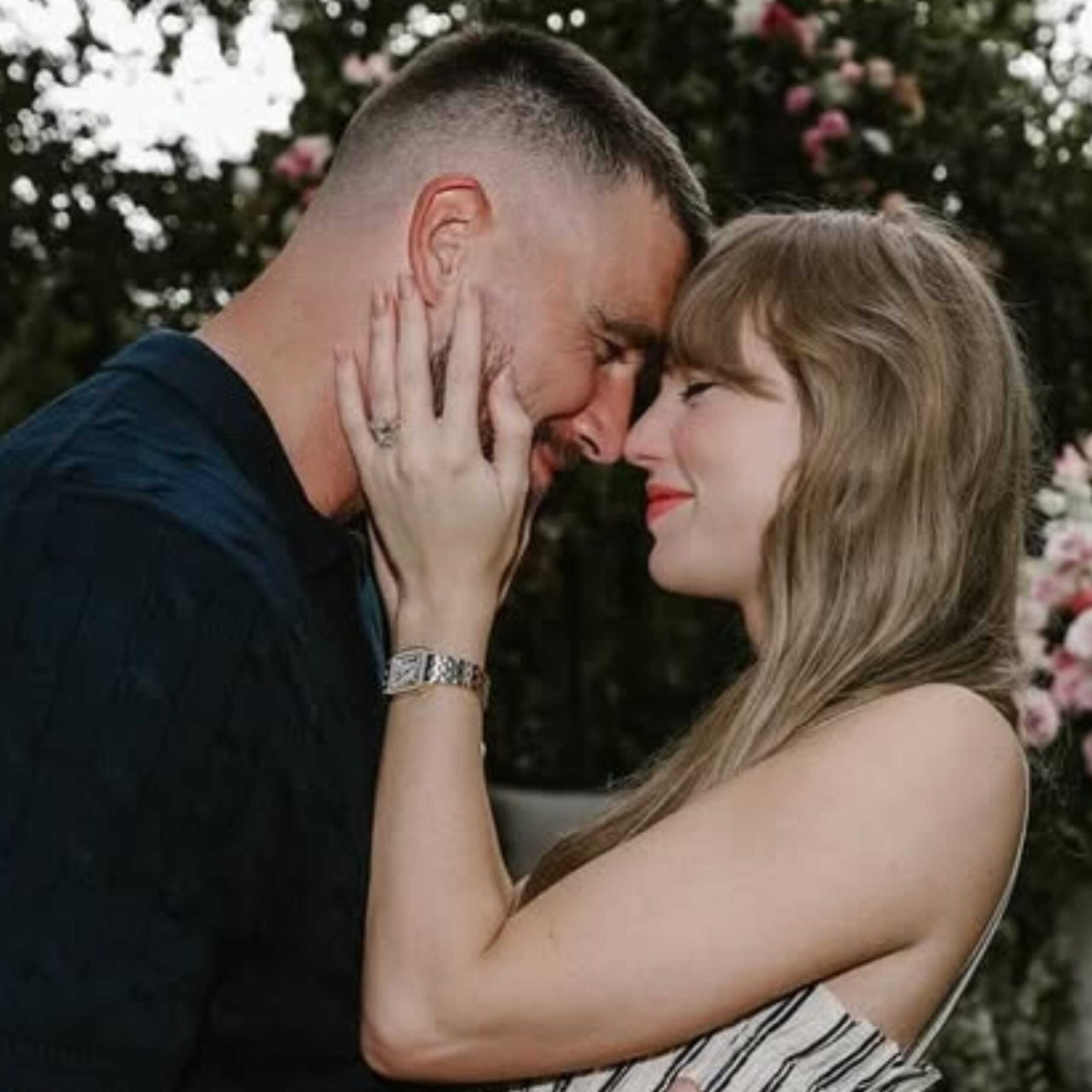 La pareja anunció el 26 de agosto de 2025 su compromiso a través de Instagram con una romántica sesión de fotos bajo un arco floral en tonos blancos y rosas, pero lo que más llamó la atención fue el impresionante anillo, cuyo valor se estima de hasta 500 mil dólares.