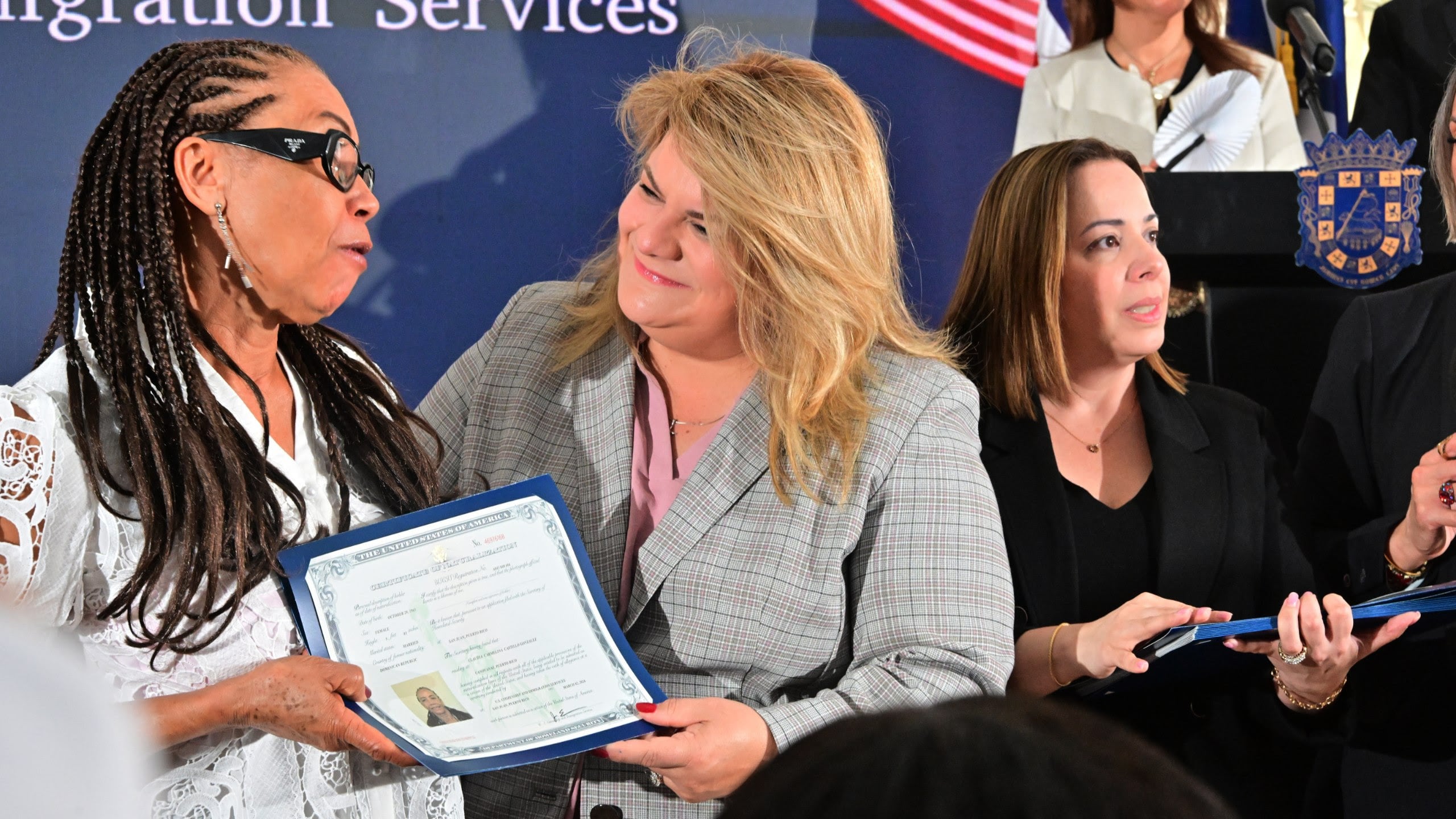 La gobernadora Jenniffer González Colón participó junto a la secretaria del Departamento de Estado, Rosachely Rivera, de una ceremonia de naturalización de nuevos ciudadanos americanos.