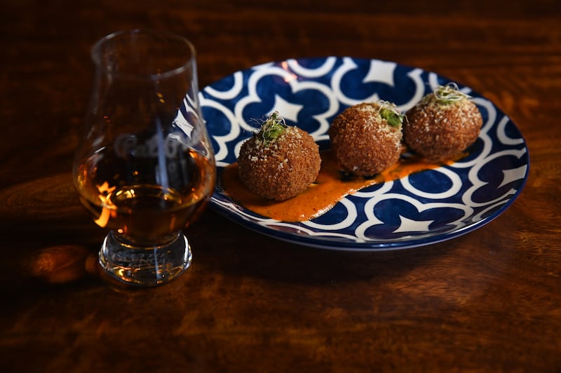 Pa’l Pueblo Whisky Bar Arancinis sobre una base de salsa infusionada con whisky. (Dennis A. Jones)