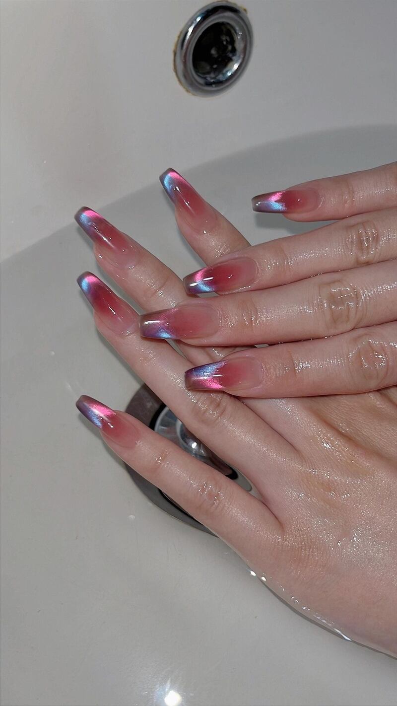 En esta técnica, toda la uña se cubre con esmalte de efecto ojo de gato. Luego, utilizando un imán especial, se manipulan las partículas metálicas para concentrarlas parcialmente en la punta. El resultado es una especie de ilusión óptica: la punta francesa aparece y desaparece dependiendo de la luz o del movimiento de los dedos. Ese efecto cambiante es precisamente lo que le da su nombre.