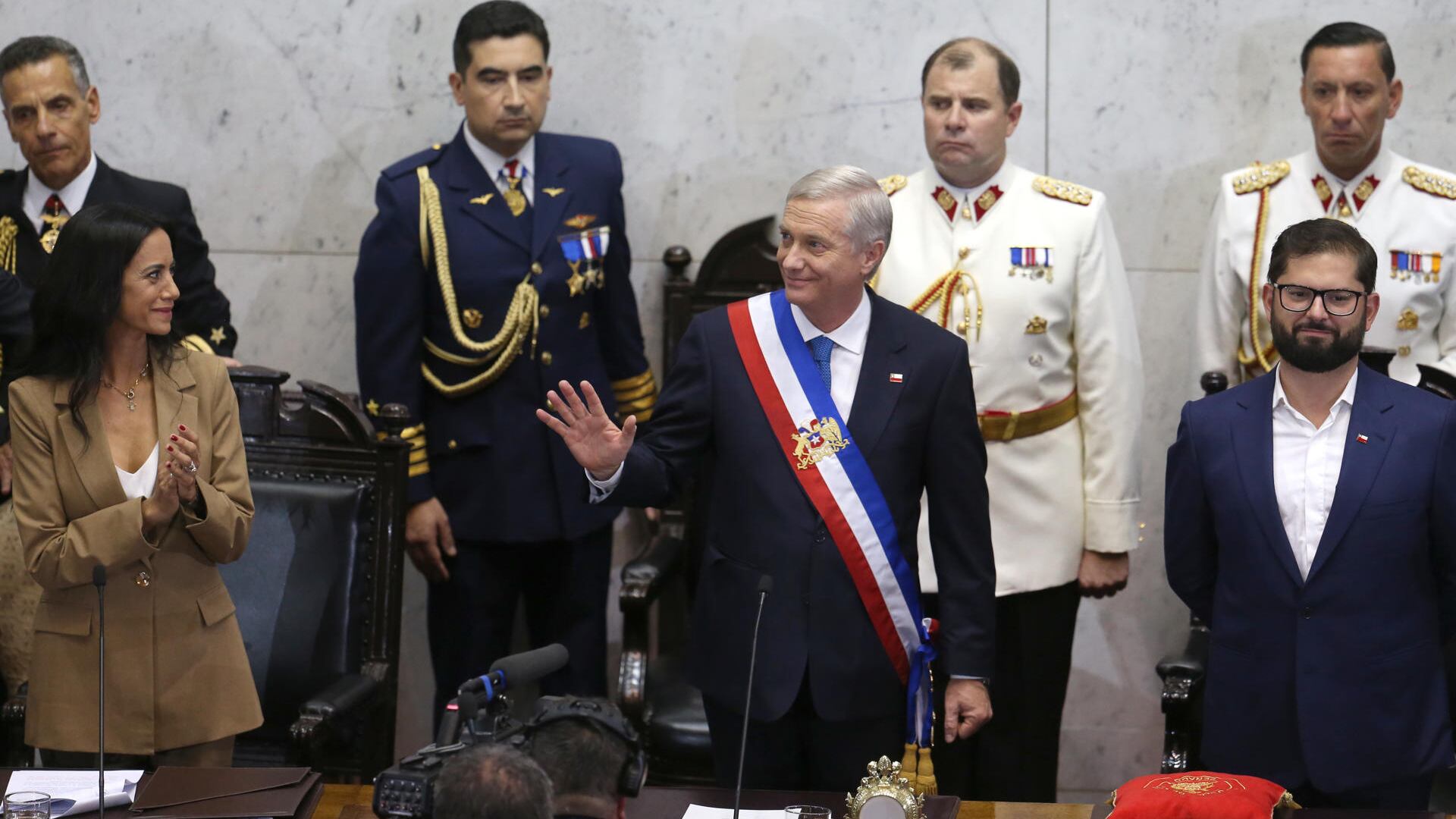 En el Salón de Honor del Senado, la nueva presidenta de la Cámara Alta, la conservadora Paulina Núñez, le impuso la banda presidencial y la medalla de O’Higgins a Kast, que sucede al progresista Gabriel Boric.