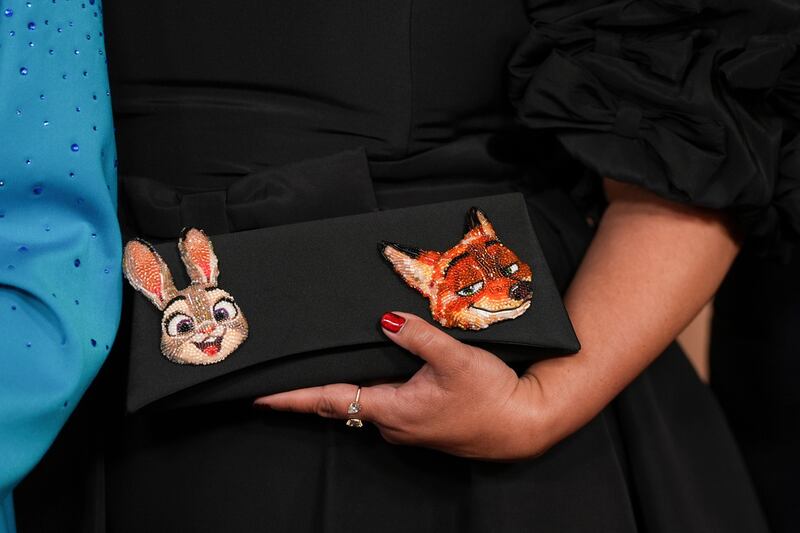 Uno de los detalles más curiosos de la noche fue un clutch decorado con figuras bordadas de un conejo y un zorro en manos de Yvett Merino, con personajes de la cnta Zootopia 2.