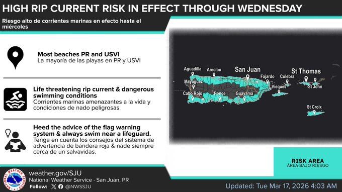 Tiempo. Riesgo alto de corrientes marinas para este martes, 17 de marzo de 2026. (X @NWSSanJuan)