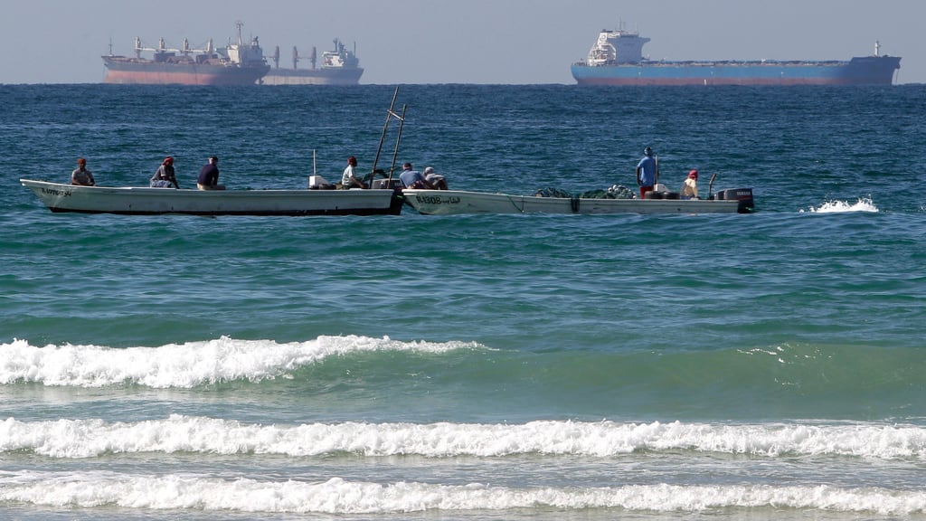 ARCHIVO – Pescadores trabajan frente a buques tanque al sur del estrecho de Ormuz, en 2012, frente a la ciudad de Ras Al Khaimah, Emiratos Árabes Unidos. (Kamran Jebreili/AP)
