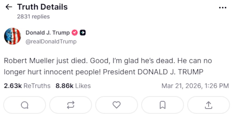 “Robert Mueller acaba de morir. Bien, me alegra que esté muerto. Ya no puede dañar a personas inocentes”, escribió el primer mandatario.