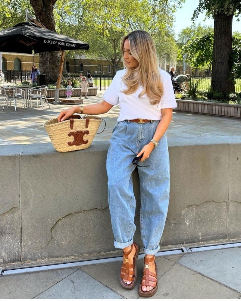 Para las más arriesgadas, los jeans wide leg o de inspiración noventera también encuentran en este calzado un gran aliado. Aquí, las sandalias aportan estabilidad visual, evitando que el look se vea desproporcionado.