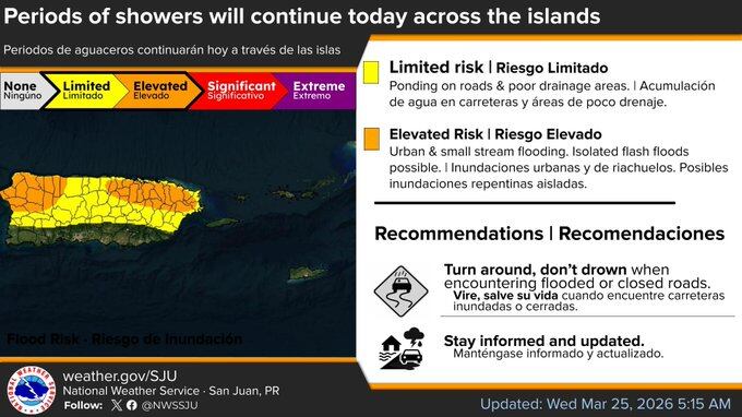 🌊 Low to moderate rip current risk#PRwx #USVIwx pic.twitter.com/ltD9oL9Hau— NWS San Juan (@NWSSanJuan) March 25, 2026
