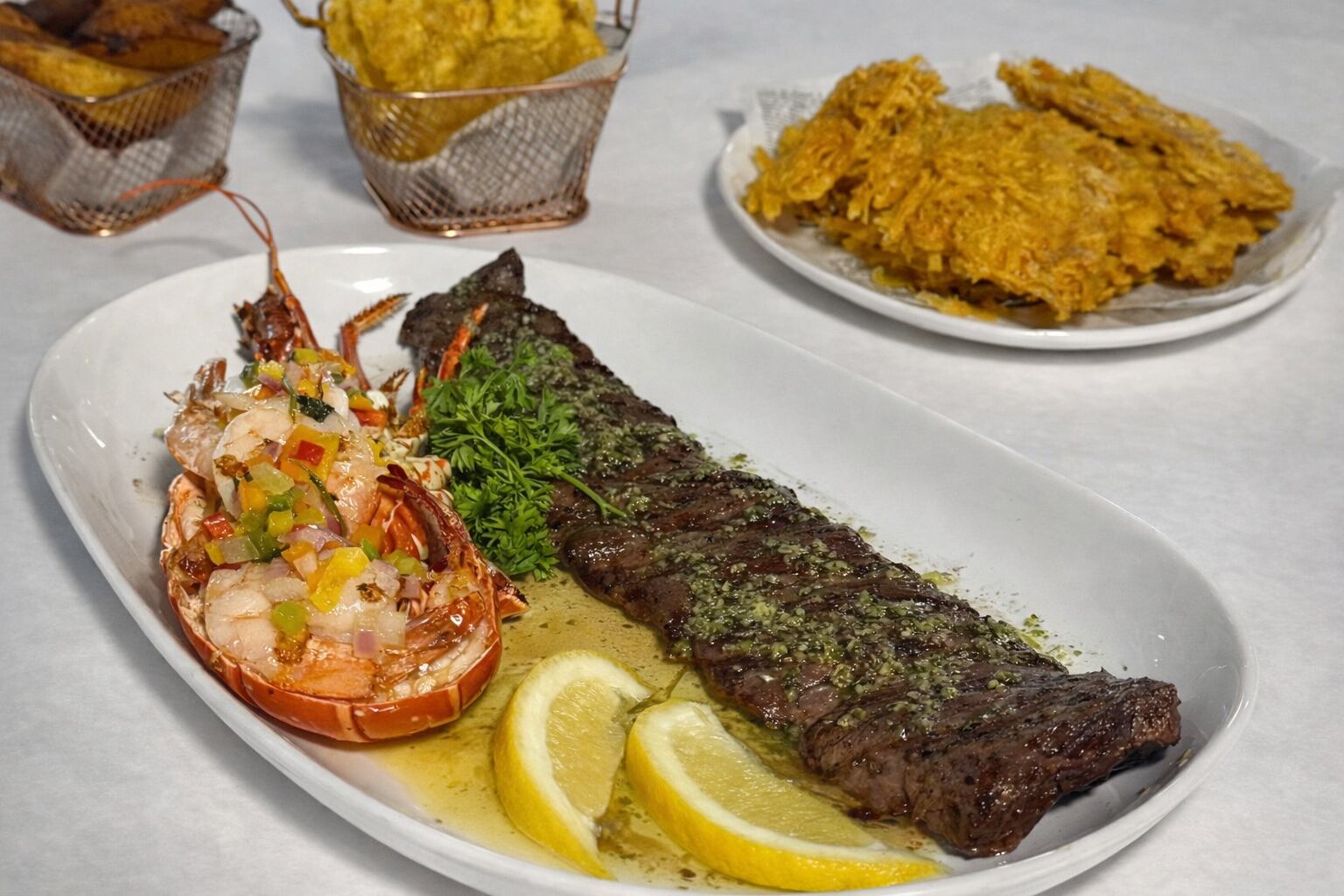 También en la sección de El Market figuran otras tentaciones como la langosta entera a la parrilla, la langosta entera rellena de mofongo, el rabo jumbo de langosta, además del chillo entero fresco, el carrucho entero fresco en temporada y la pesca fresca del día, según disponibilidad.