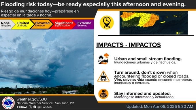 Riesgo de inundaciones. Tiempo para el lunes, 6 de abril de 2026. (X @NWSSanJuan)
