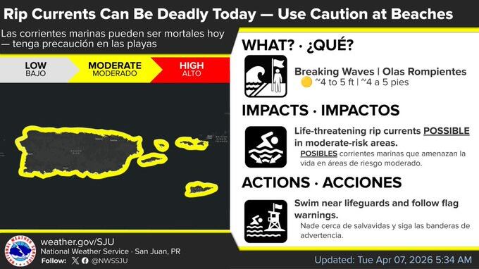 Tiempo para el martes, 7 de abril de 2026. Las corrientes marinas pueden ser mortales hoy. (X @NWSSanJuan)