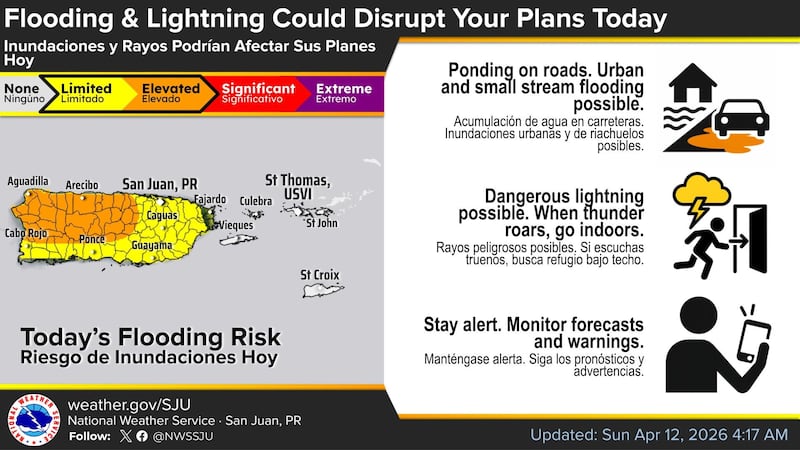 El Servicio Nacional de Meteorología (SNM) en San Juan emitió hoy, domingo, una vigilancia de inundaciones para todo Puerto Rico, desde la mañana del lunes hasta la mañana del miércoles, ante el aumento en el riesgo de lluvias intensas asociadas a un sistema atmosférico que se aproxima a la región.