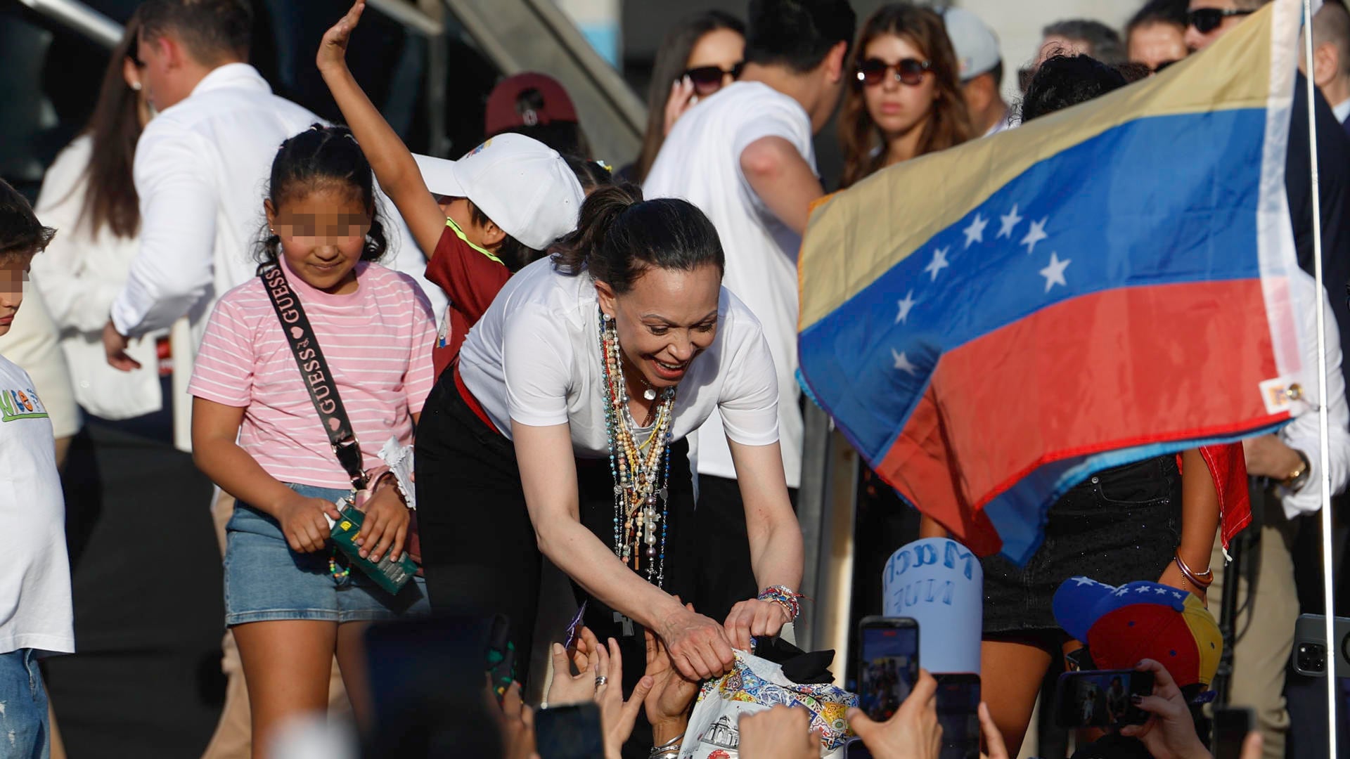 Miles de personas se concentraron desde horas de la tarde en el centro de Madrid para recibir a la dirigente venezolana María Corina Machado, quien salió al balcón de la sede de la presidencia regional tras recibir una distinción oficial.