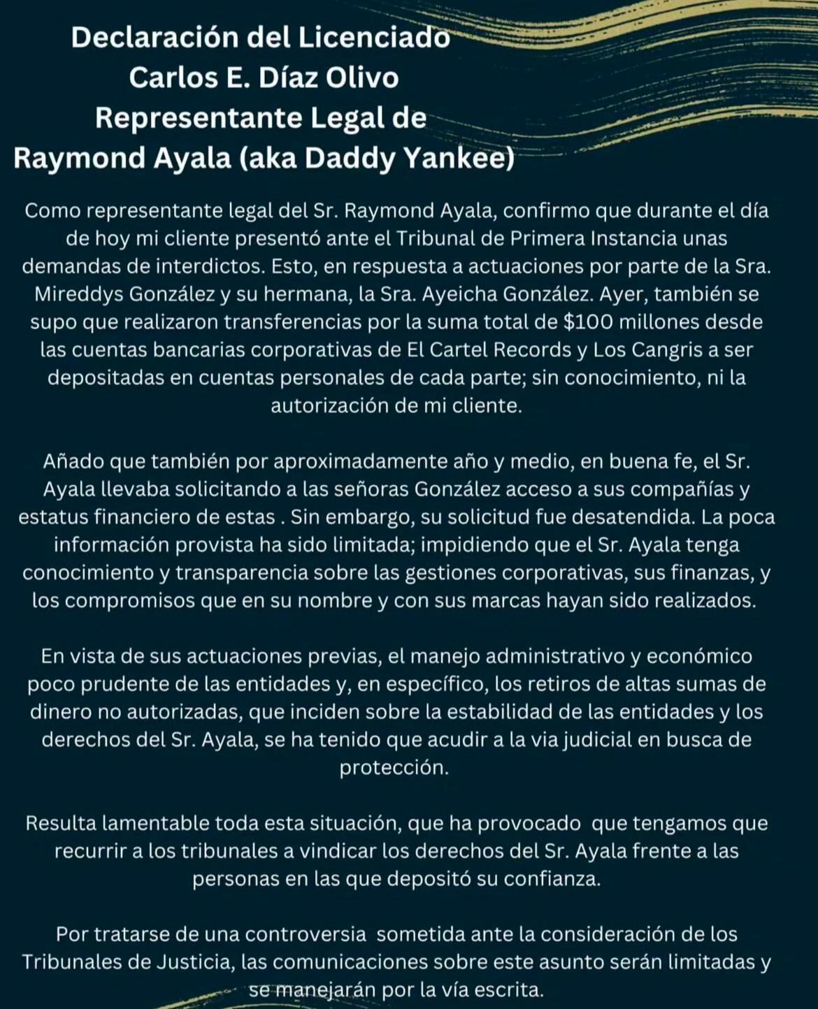 “Como representante legal del Sr. Raymond Ayala, confirmo que durante el día de hoy mi cliente presentó ante el Tribunal de Primera Instancia unas demandas de interdictos. Esto, en respuesta a actuaciones por parte de la Sra. Mireddys González y su hermana, la Sra. Ayeicha González. Ayer, también se supo que realizaron transferencias por la suma total de $100 millones desde las cuentas bancarias corporativas de El Cartel Records y Los Cangris a ser depositadas en cuentas personales de cada parte; sin conocimiento, ni la autorización de mi cliente”, lee la carta del abogado.